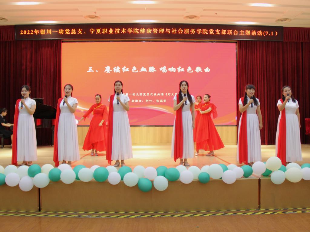 宁职健康管理与社会服务学院党员代表张娜、石法强老师诵读了《党旗颂》。银川市第一幼儿园党员代表表演了《灯火里的中国》。全体党员共唱《没有共产党就没有新中国》。嘹亮的歌声唱出了全体党员对党的无限忠诚、对祖国的美好祝愿、对事业的诚挚热爱。