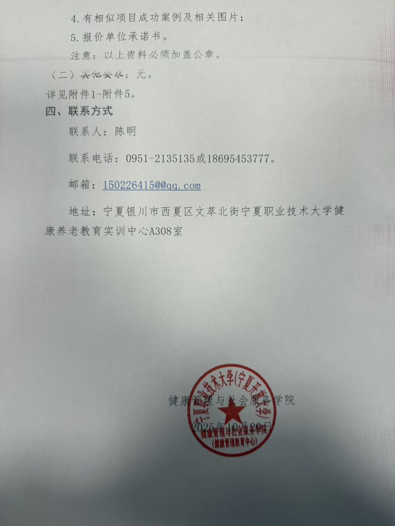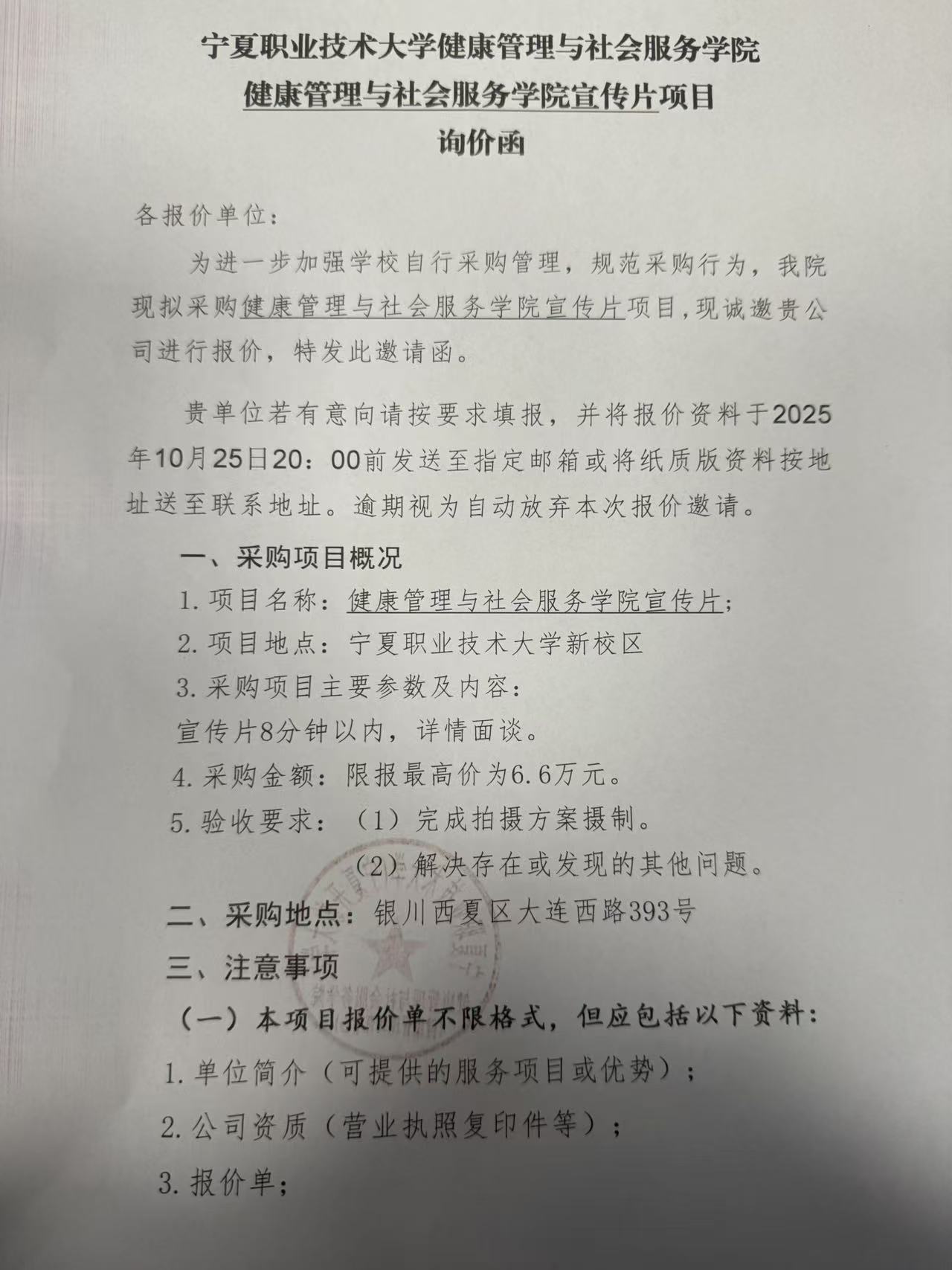 宁夏职业技术大学健康管理与社会服务学院 健康管理与社会服务学院宣传片项目 询价函