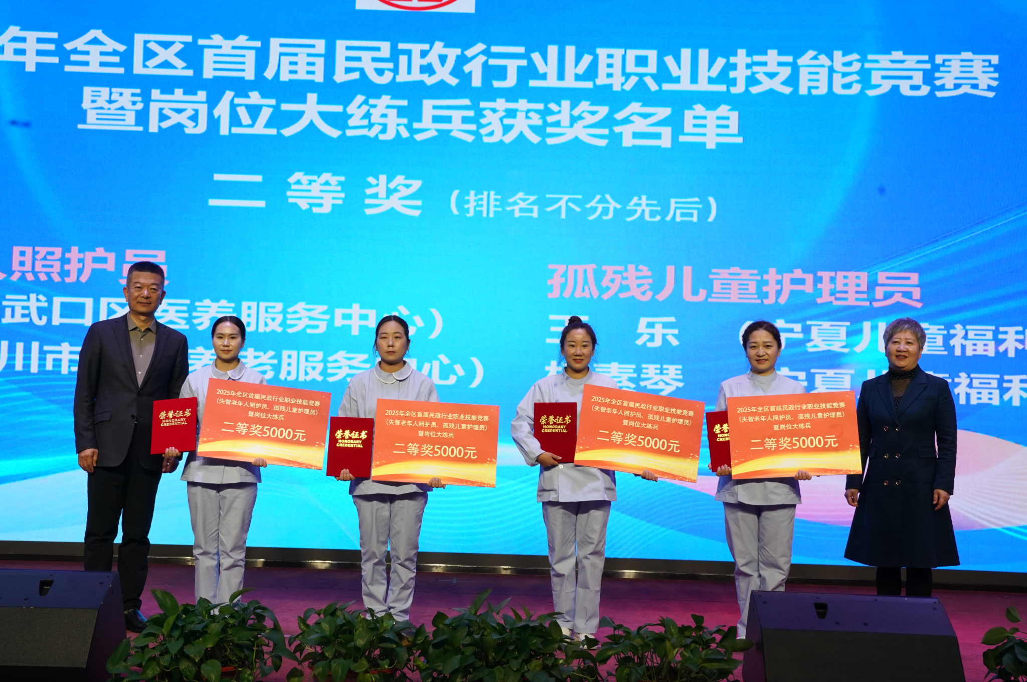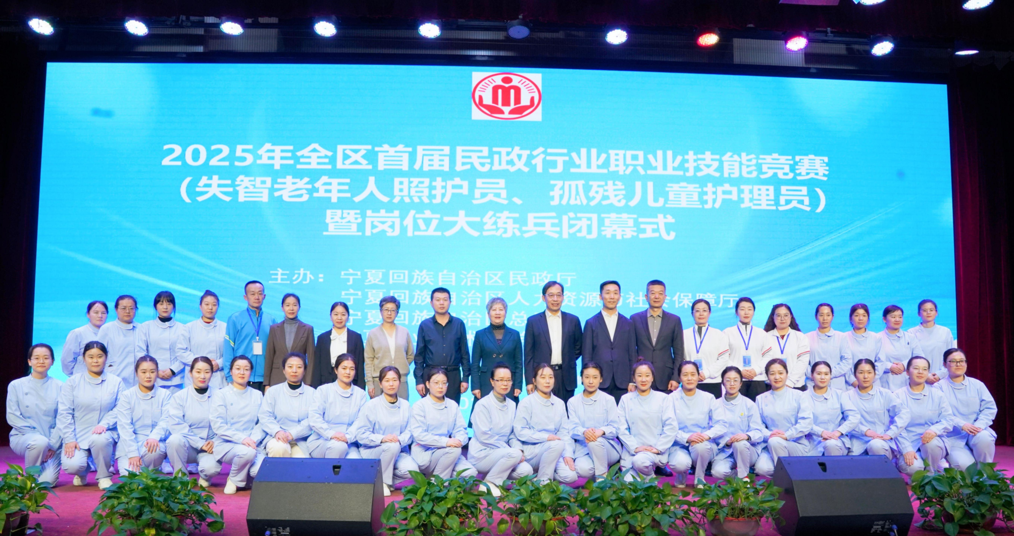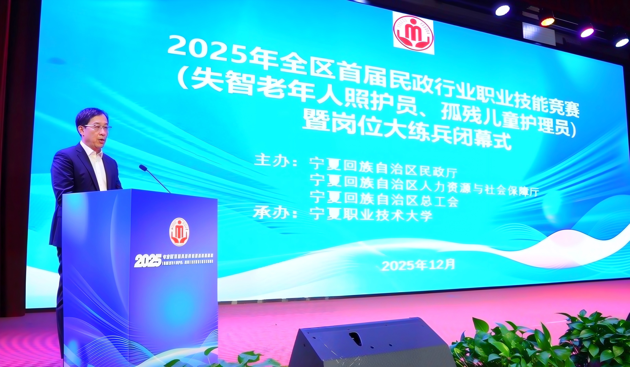 2025年12月18日至19日,由自治区民政厅、人力资源和社会保障厅、总工会联合主办,宁夏职业技术大学承办的2025年全区养老护理员(失智老年人照护员)技能竞赛在银川顺利收官。19日下午,自治区民政厅副厅长张进军、学校校长袁正国、副校长李晓延出席闭幕式并颁奖,自治区民政厅、人社厅、总工会相关处室负责人及来自全区五市的百余位参赛选手齐聚宁职校园,以赛竞技、以赛交流,展现了新时代养老护理从业者的专业素养与人文情怀。